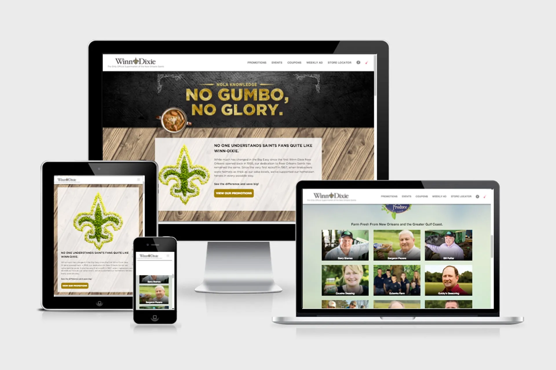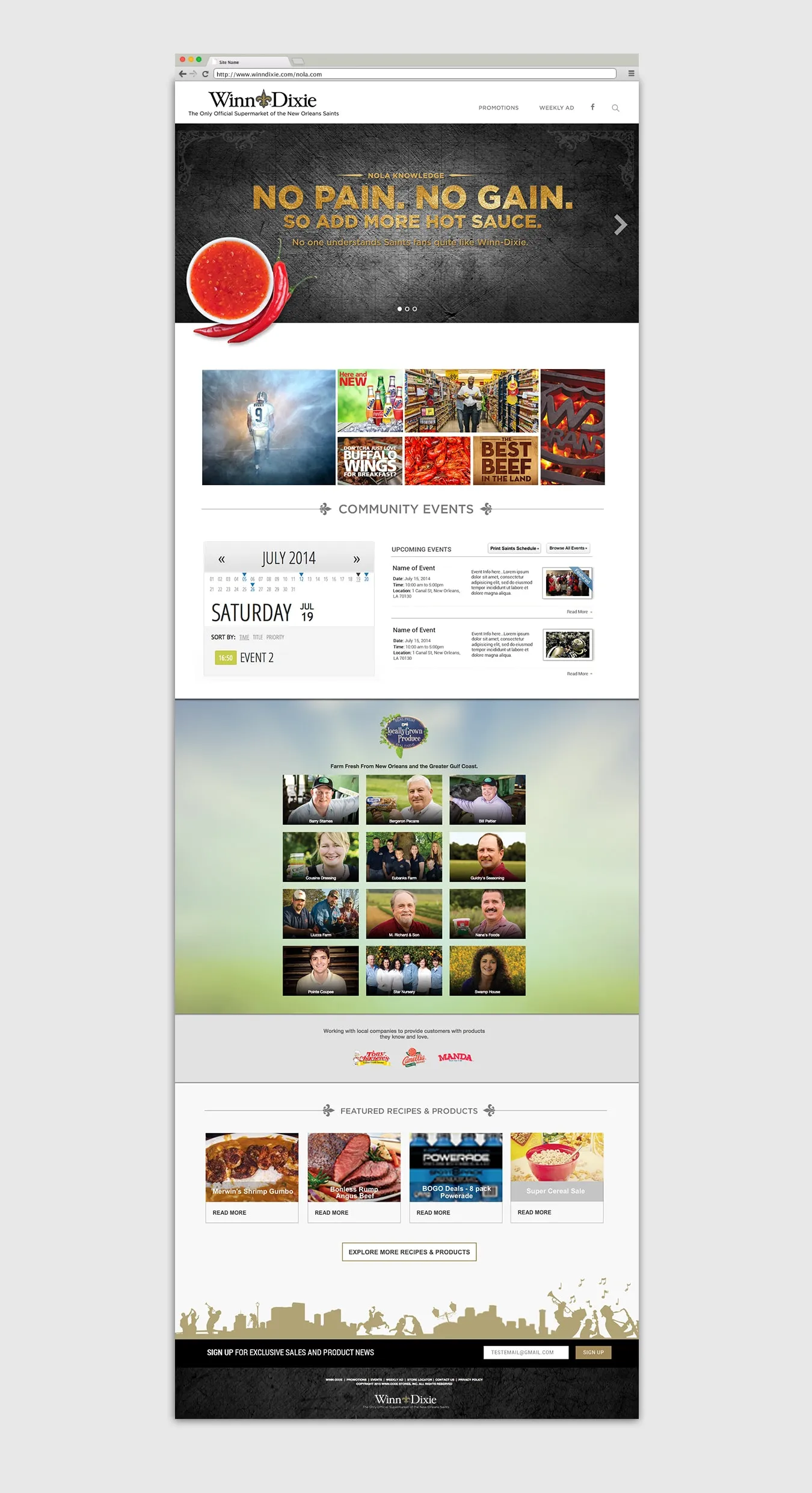 With the NOLA campaign I was tasked with designing a micro-site that would cater to New Orleans customers and its surrounding areas. The challenge was to stay Winn-Dixie branded but create a unique look and feel that was specially made and personalized for NOLA enthusiasts and Saints football fans a-like.